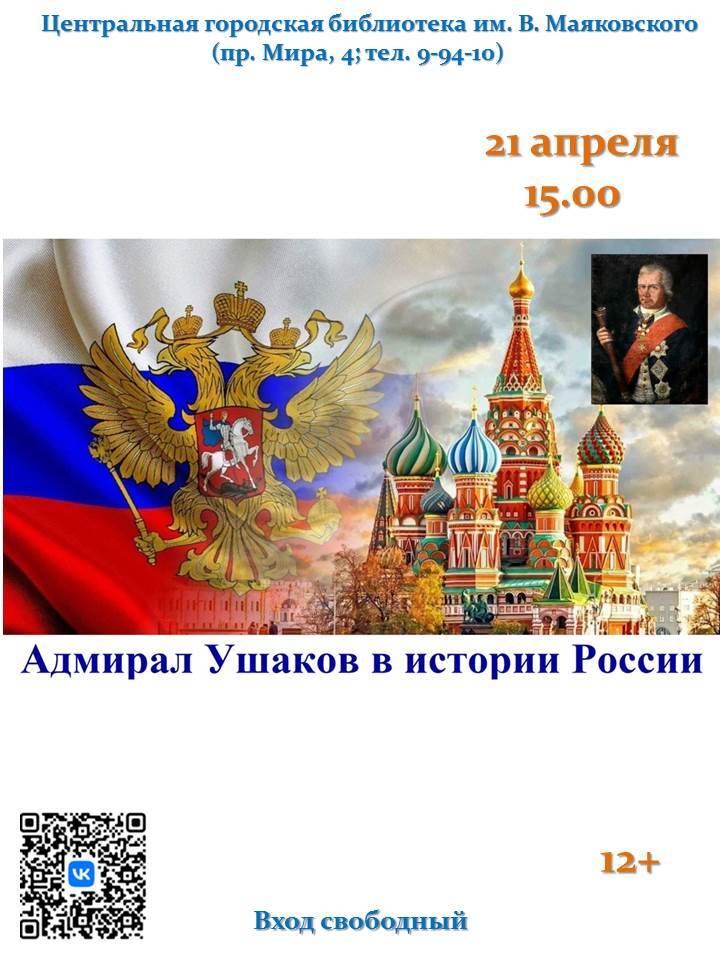 21 апреля в 15.00 библиотека им. В. Маяковского приглашает горожан на историческую беседу «Адмирал Ушаков в истории России!», подготовленную председателем саровской общественной организации ветеранов ВМФ имени Федора Ушакова, капитаном 2 ранга запаса Сергеем Михайловичем Яковлевым.