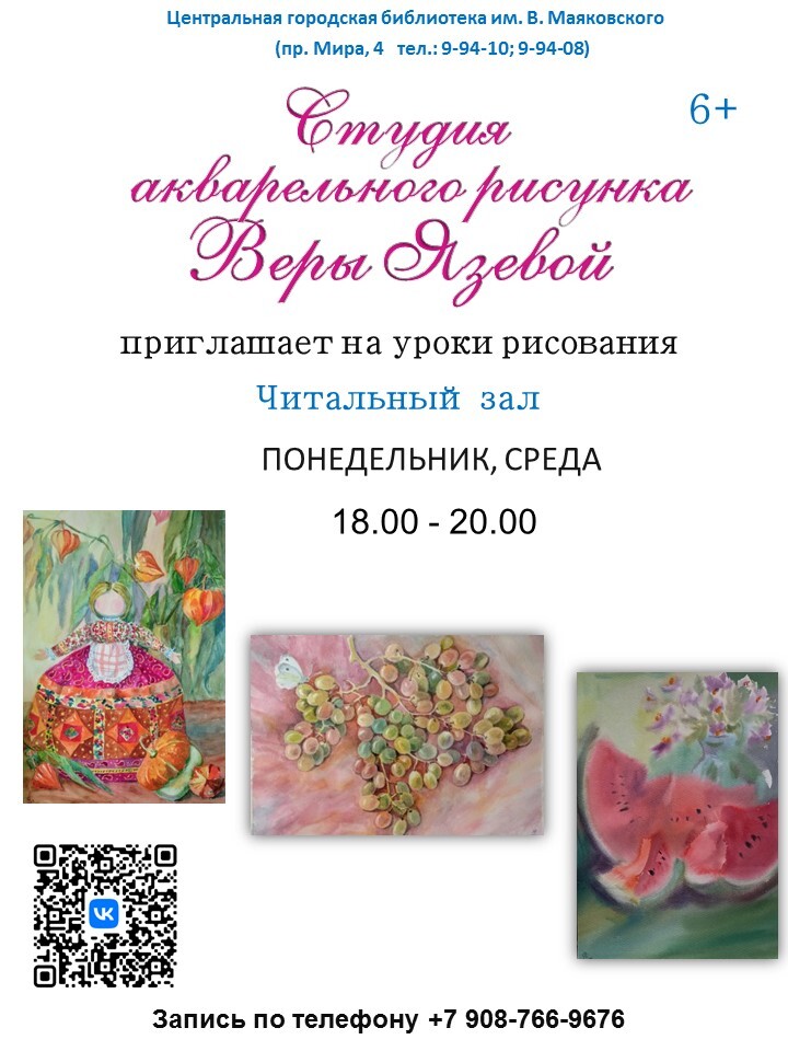 Занятия проходят в читальном зале библиотеки в небольших уютных группах. Педагог Вера Язева всё это время рядом - озадачивает, вдохновляет и направляет на то, как последовательно вести работу и заканчивать начатое. Студия акварельного рисунка Веры Язевой приглашает молодёжь и людей старшего возраста присоединиться к урокам рисования и приобщиться к тонкостям акварельной живописи.