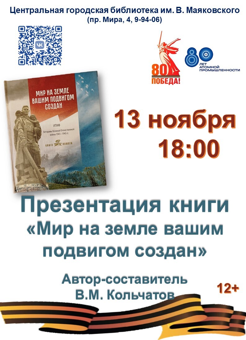 13 ноября в 18:00 в библиотеке им. В. Маяковского состоится презентация книги «Мир на земле вашим подвигом создан» автора-составителя В.М. Кольчатова.