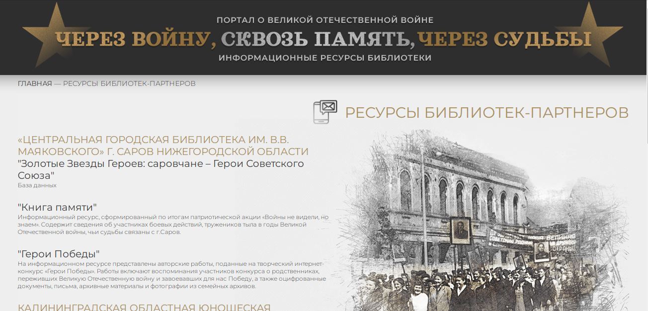 В рамках сотрудничества библиотеки им. В. Маяковского с Могилевской областной библиотекой им. В.И. Ленина (Республика Беларусь) информационные материалы и базы данных, созданные в рамках проектов и конкурсов сотрудниками Маяковки и жителями нашего города, расположены на портале о Великой Отечественной войне «Через войну, сквозь память, через судьбы» в разделе «Ресурсы библиотек-партнеров».