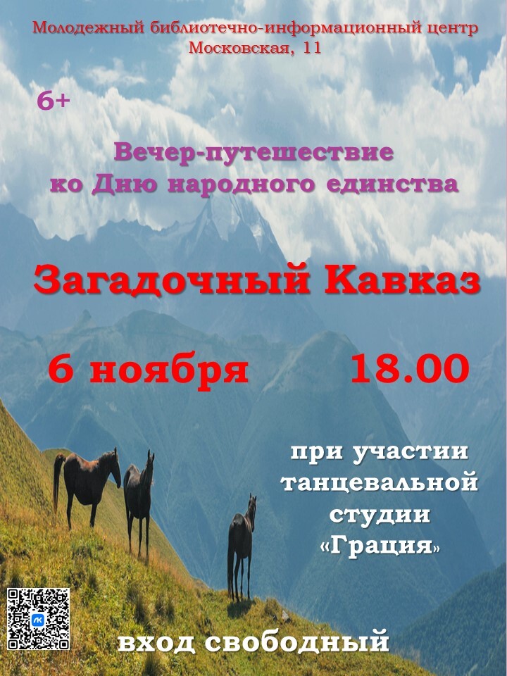 6 ноября в 18.00 в Молодёжном библиотечно-информационном центре состоится вечер «Загадочный Кавказ», посвященный Дню народного единства. Гости и участники вечера смогут отправиться в удивительное путешествие. Кавказ - одно из красивейших мест в России и в мире с его удивительной, поражающей воображение природой, неизменно притягивал к себе людей творческих. Поэты, композиторы и художники – каждый воспевал Кавказ по-своему. Интерес и восхищение вызывали и населяющие эти места гордые и свободолюбивые люди с их независимым характером, самобытной культурой, обычаями и традициями. В ходе вечера гости услышат рассказ о необычных местах и тайнах Кавказа, а также увидят выступление городского танцевального коллектива «Легенды Кавказа» (студии «Грация»). Мы надеемся, что вечер подарит гостям библиотеки массу позитивных эмоций, которые надолго останутся в памяти. Вход свободный.