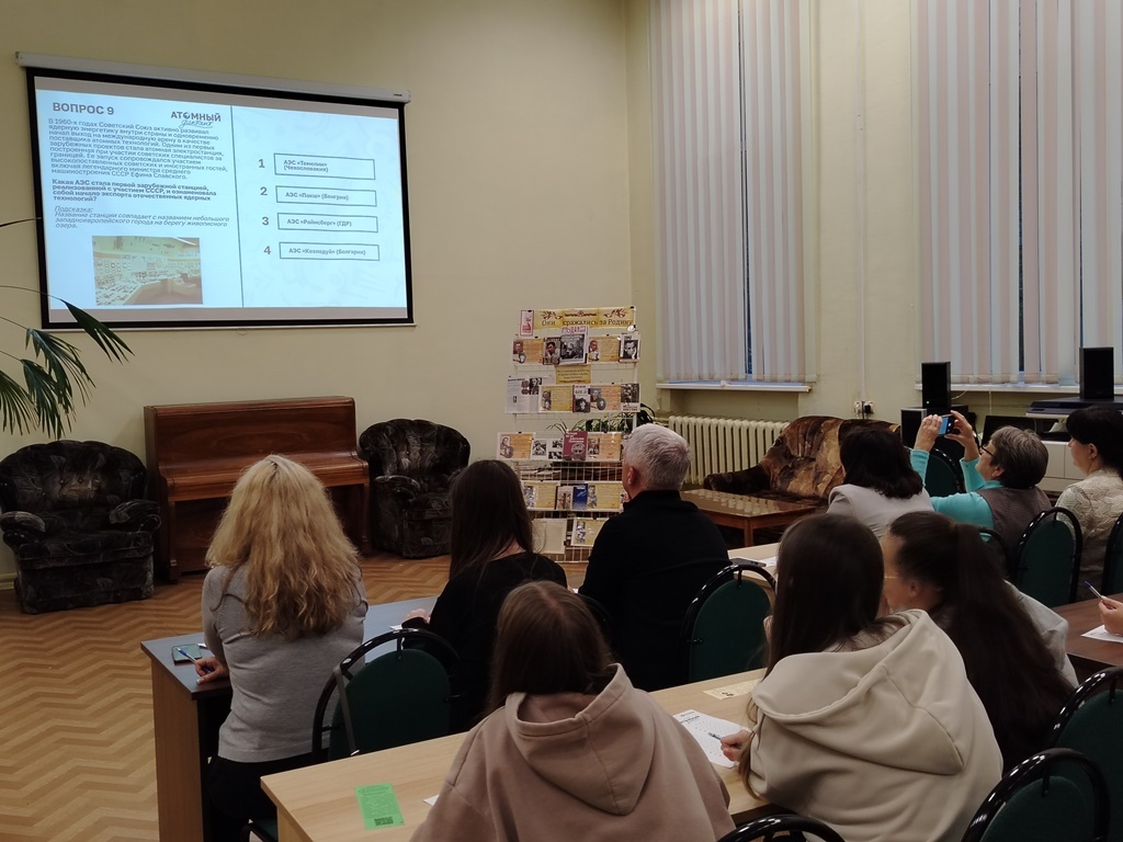 Участники проверяют свои знания, отвечая на вопросы об истории, достижениях, безопасности и экологии атомной промышленности, а также о её современном применении в различных сферах, таких как медицина, освоение Арктики и космоса.