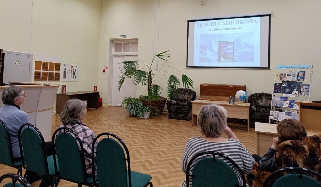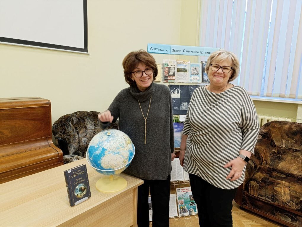 Ярким дополнением к мероприятию стала книжно-иллюстративная выставка «Арктика: от Земли Санникова до наших дней», где представлены разные издания романа В. Обручева, книги по географии и истории освоения Арктики, материалы о современных полярных станциях и экспедициях.