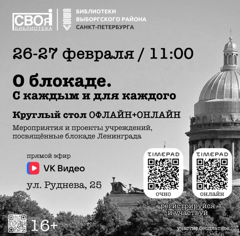 26 и 27 февраля в Санкт-Петербурге прошел круглый стол «О блокаде. С каждым и для каждого», организаторами которого в стали специалисты библиотеки «СВОя» ЦБС Выборгского района. Цель конференции - представить мероприятия и проекты разных библиотек, посвященные блокаде Ленинграда. Около 30-ти участников из разных уголков России в онфлайн и онлайн формате делились в рамках круглого стола опытом работы с этой темой и интересными формами взаимодействия с разновозрастной аудиторией.