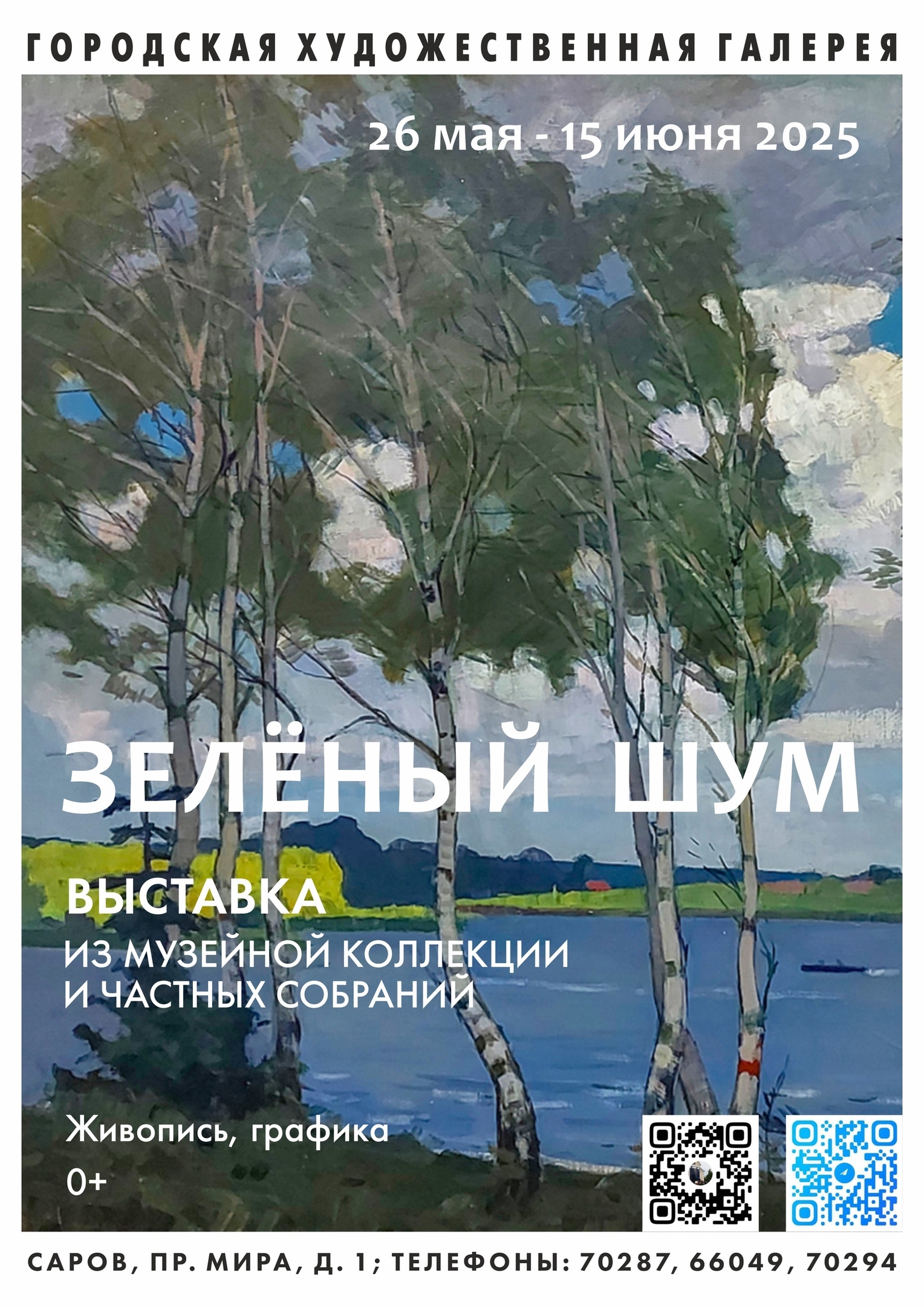 Выставка «ЗЕЛЁНЫЙ ШУМ» в Художественной галерее продолжает серию выставок знакомящих зрителей с нашей художественной коллекцией. Всего три недели экспонирования, с 26 мая по 15 июня, совпадает с теми разительными изменениями в природе, когда календарная весна сменяется летом. Это время насыщенного зеленого цвета в кронах деревьев, на газонах в скверах и парках, лес становится зеленым массивом и даже водоёмы вторят бушующему морю листвы. Художники не очень любят вошедшее в полную силу лето – первоцветы уже давно отцвели, много однообразной зелени, а до цветения середины лета еще далеко. Но мы постарались выбрать из нашей художественной коллекции те картины, которые соответствуют началу лета и показываем то невероятное разнообразие зеленых оттенков, давая возможность зрителям «услышать» зеленый шум, а художников вдохновить на новые летние работы. В экспозицию начала лета вошли 48 произведений 34 художников из нашей художественной коллекции и частных собраний.