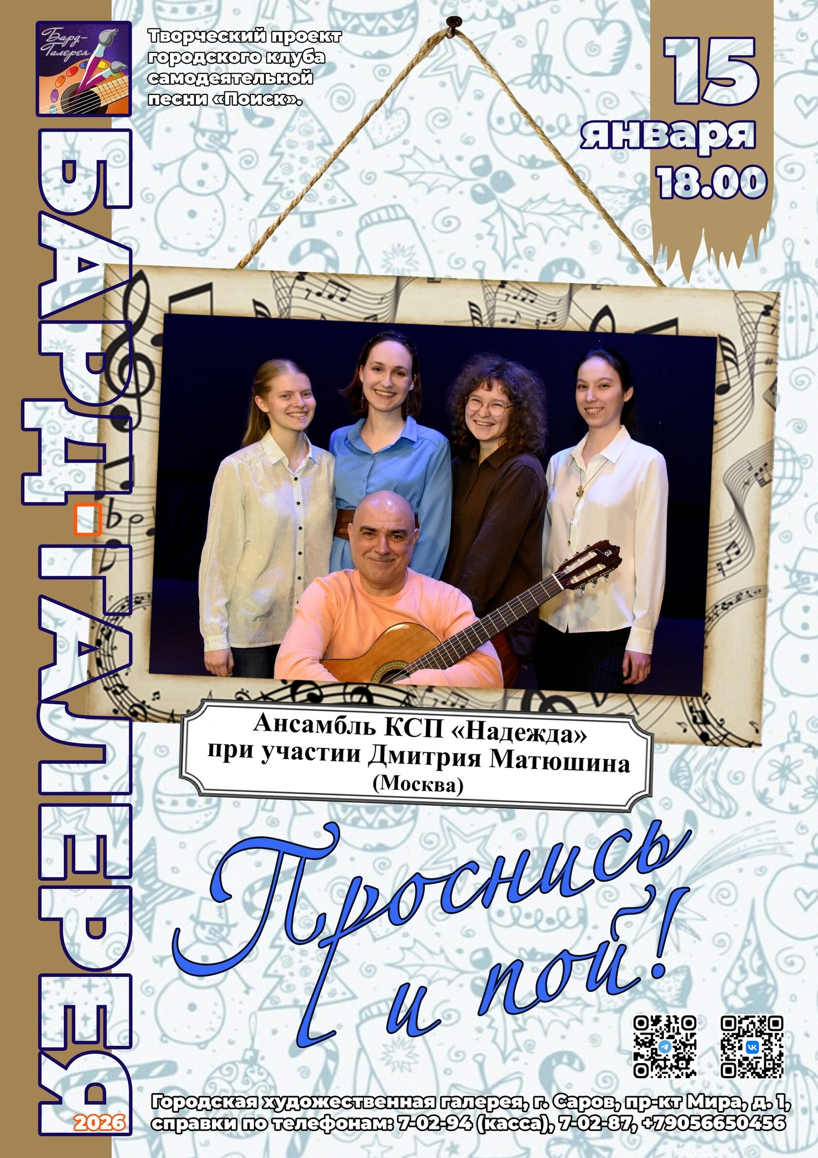 15 января в 18:00 приглашаем всех в Художественную галерею на концерт «Проснись и пой!» КСП «Надежда» при участии Дмитрия Матюшина (Москва). Приходите, начнем музыкальный 2026 год с хорошей бардовской песни!
