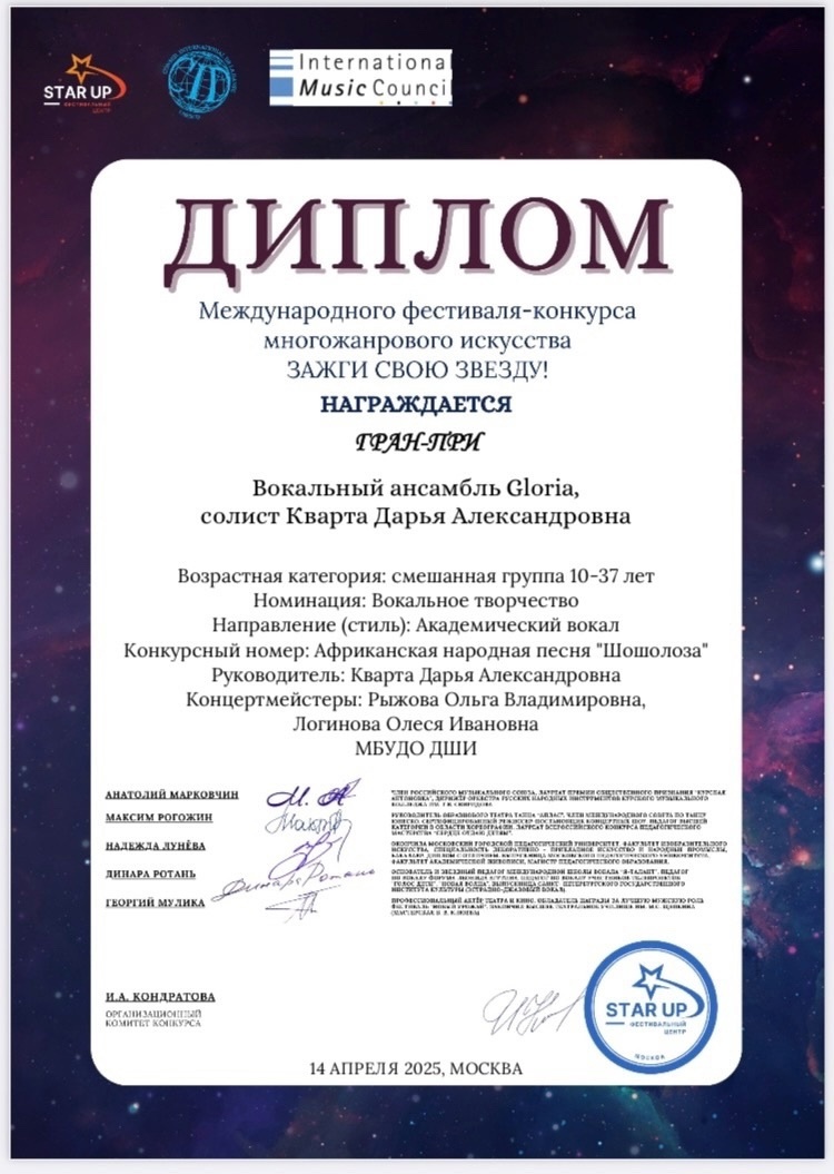 14 апреля прошел дистанционный Международный фестиваль-конкурс «Зажги свою звезду», г.Москва. По итогам конкурса вокальный ансамбль Gloria стал обладателем Гран-при, руководитель Кварта Дарья Александровна, концертмейстеры: Рыжова Ольга Владимировна и Логинова Олеся Ивановна, а так же получил сертификат на участие в следующем конкурсе.