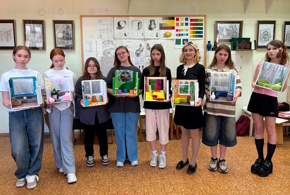 Спокойное и созерцательное настроение от голубовато-серого прохладного моря, погружение в дикую природу, тепло солнечного света, задорный и яркий, уютный и функциональный – все это в идеях интерьерных макетов пятиклассниц. Среди авторских находок – витражное окно, автомат для выдачи еды и напитков, террариум.