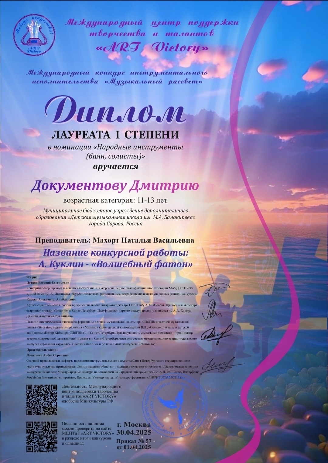 Поздравляем Документова Дмитрия (преп. Н.В.Махорт) с присуждением звания Лауреата I степени на Международном дистанционном конкурсе инструментального исполнительства «Музыкальный рассвет», г.Москва!