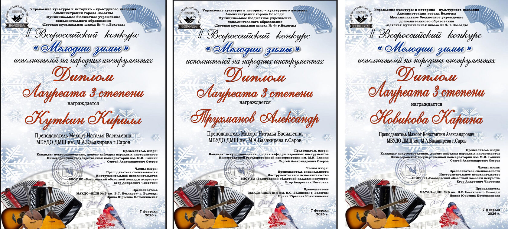 Детскую музыкальную школа им.М.А.Балакирева в дистанционном формате представляли учащиеся народного отдела: юные баянисты Куткин Кирилл и Трухманов Александр (преп. Махорт Наталья Васильевна), а также гитаристка Новикова Карина (преп. Махорт Константин Александрович).