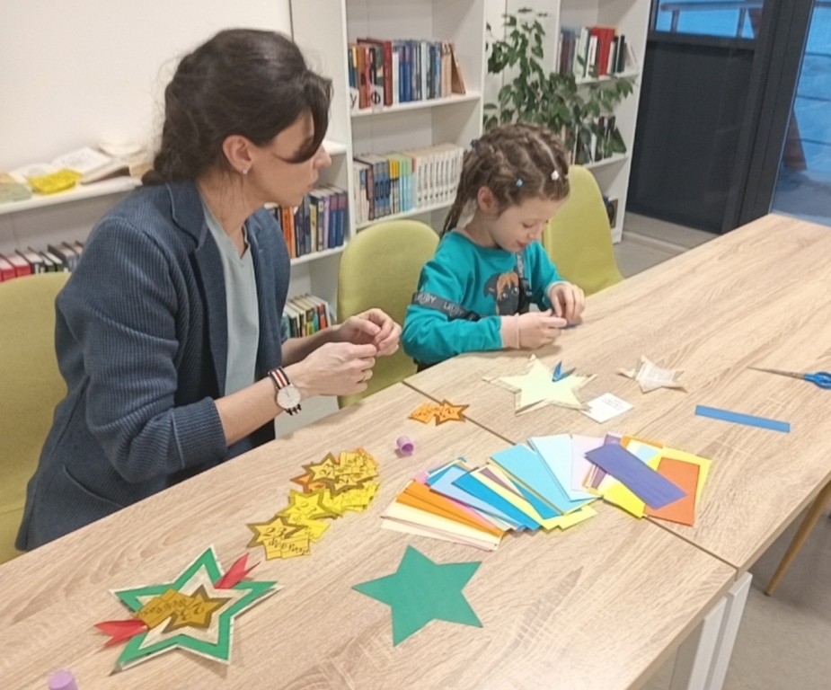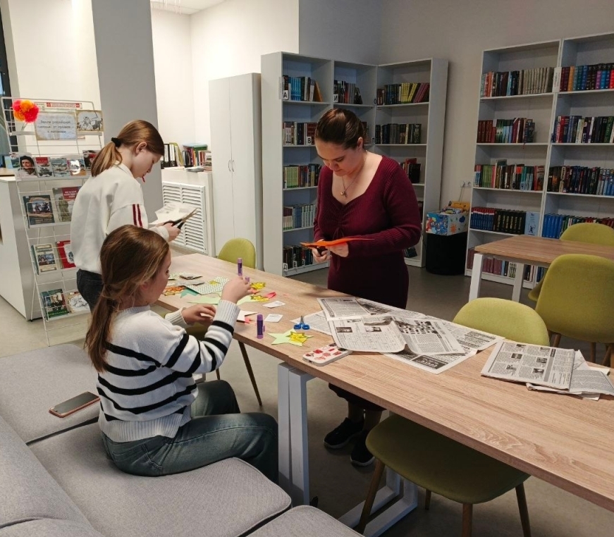 С первых минут мероприятия царила тёплая, праздничная атмосфера. Библиотека преобразилась в творческую мастерскую: на столах были разложены материалы для рукоделия, а выставка «Земли российской сыновья: от предков — к потомкам» стала центральным элементом оформления пространства ко Дню защитника Отечества.