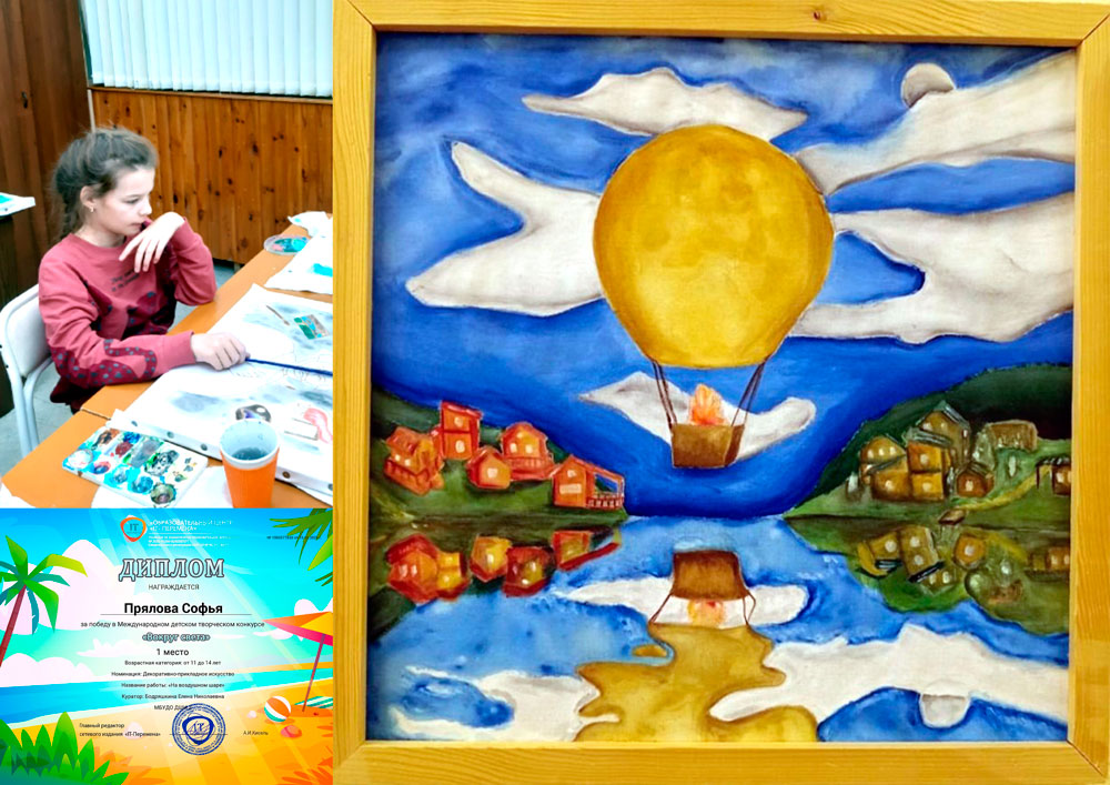 Международный детский творческий конкурс «Вокруг света» прошел в Образовательном центре «IT- Перемена». На этот конкурс отправили работу в технике «Рисунок по ткани» Пряловой Софьи – «На воздушном шаре». В номинации декоративно-прикладное творчество Софья получила 1 место в своей возрастной группе.