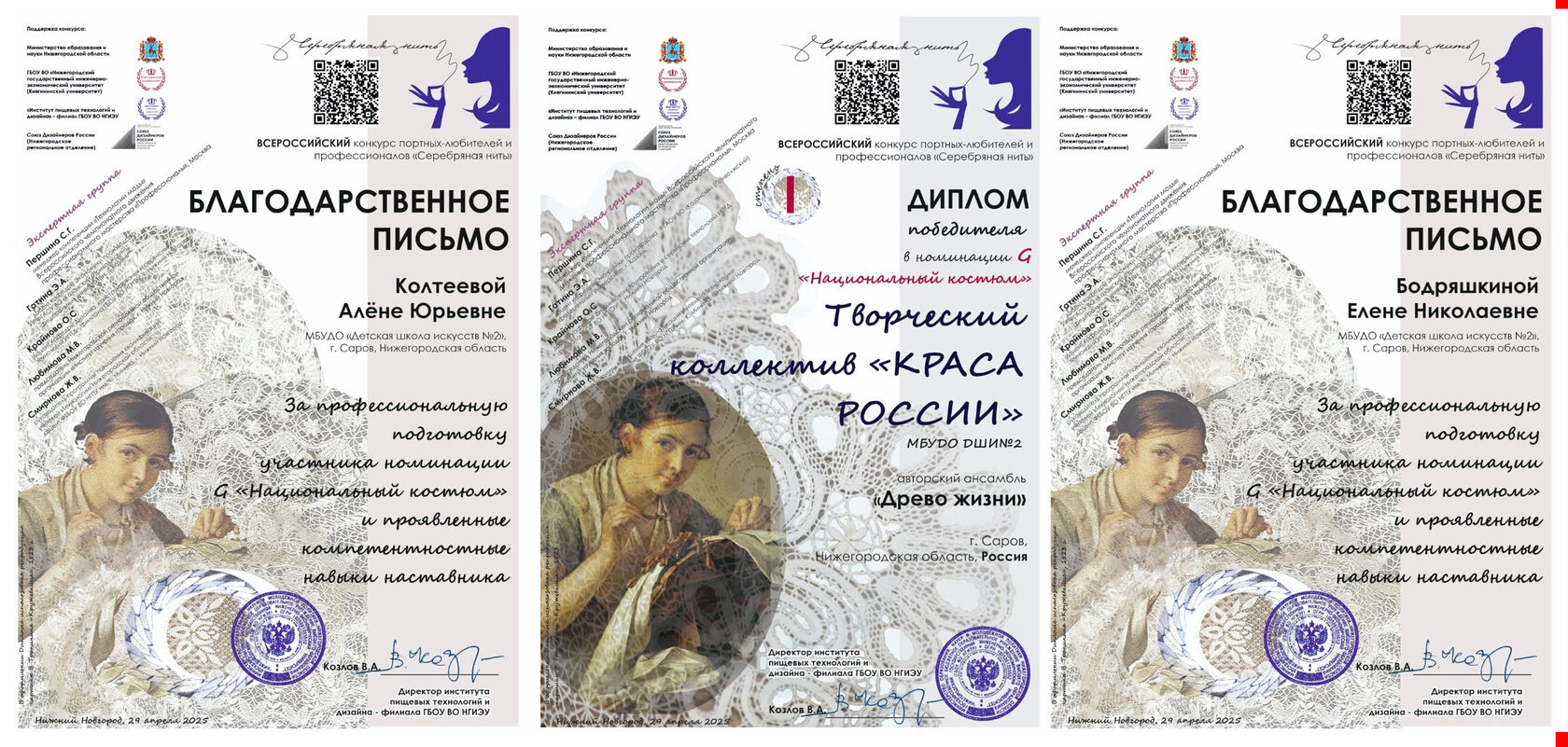 Сейчас конкурс проходит в режимах онлайн и офлайн. На видео, которое было выставлено для голосования, были не все работы, представленные на конкурс. Авторитетное жюри отсматривало все варианты, и вот в номинации G (национальный костюм) Образцовый (народный) коллектив «Краса России» стал ПОБЕДИТЕЛЕМ получив диплом 1 степени! Работа учениц 4 класса отделения «Дизайн одежды и ткани» - «Древо жизни» под руководством преподавателя Бодряшкиной Елены Николаевны и мастера производственного обучения Колтеевой Алены Юрьевны оценена по достоинству! Коллектив награжден денежным сертификатом для закупки материалов и фурнитуры на платформе ОЗОН.