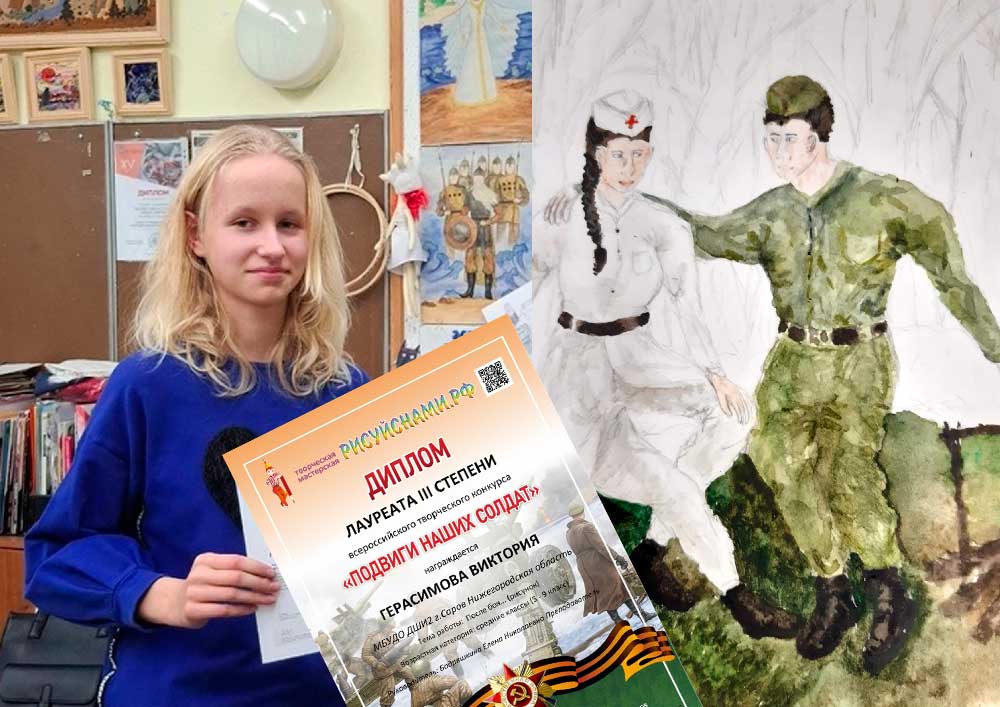 Свой рисунок (в технике акварель) «После боя» на конкурс представила Герасимова Виктория ДШИ №2 (класс преподавателя Бодряшкиной Елены Николаевны). По итогам Виктория получила диплом лауреата III степени.