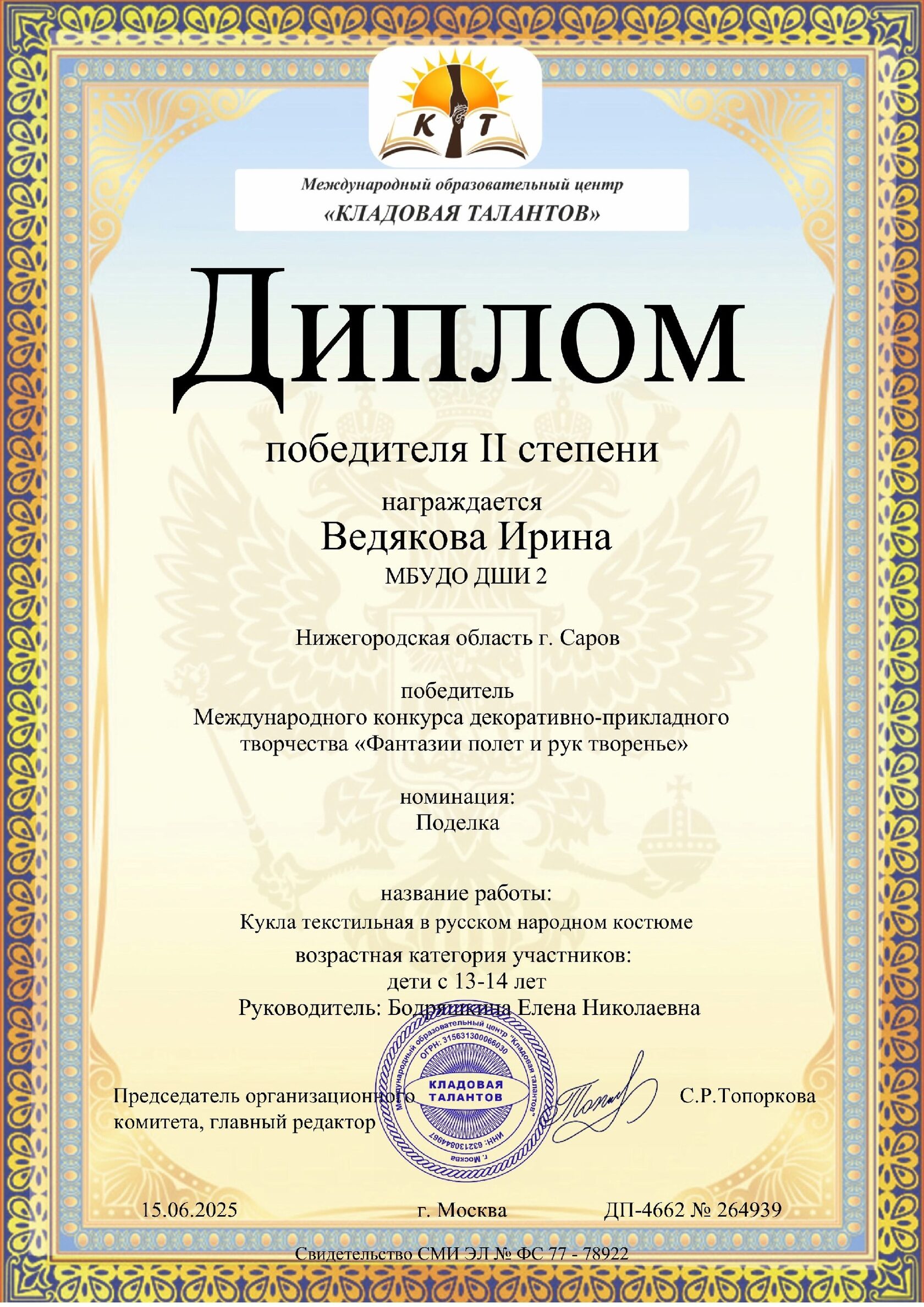 Международный образовательный центр «Кладовая талантов» (г. Москва) провел конкурс декоративно - прикладного творчества «Фантазии полёт и рук творенье». От ДШИ №2 отделения «Дизайн одежды и ткани» в этом Международном конкурсе приняла участие Ведякова Ирина в номинации «Поделка».