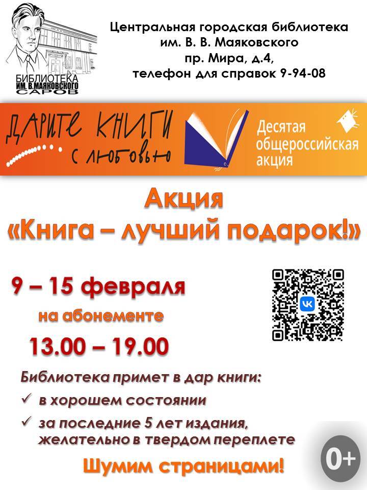 В начале февраля библиотека им. В. Маяковского присоединится к десятой общероссийской акции «Дарите книги с любовью», приуроченной к Международному дню книгодарения (14 февраля). Маяковка традиционно станет одной из ключевых площадок акции в Сарове.