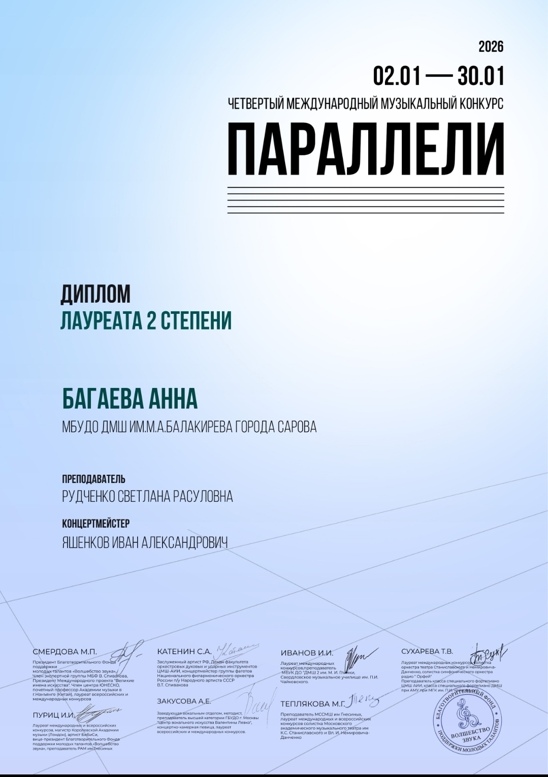 В январе учащаяся духового отделения Детской музыкальной школы – Багаева Анна (преп.С.Р.Рудченко, конц.И.А.Яшенков) приняла участие в престижном Четвёртом Международном музыкальном конкурсе «Параллели».