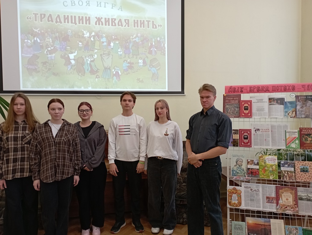 В последний день сентября в читальном зале Маяковки для учащихся школ города в рамках проекта «Пушкинская карта» состоялась увлекательная познавательная игра-викторина «Традиции живая нить». Участники погрузились в мир русских обычаев и традиций, вспомнили обряды и историю народных праздников.